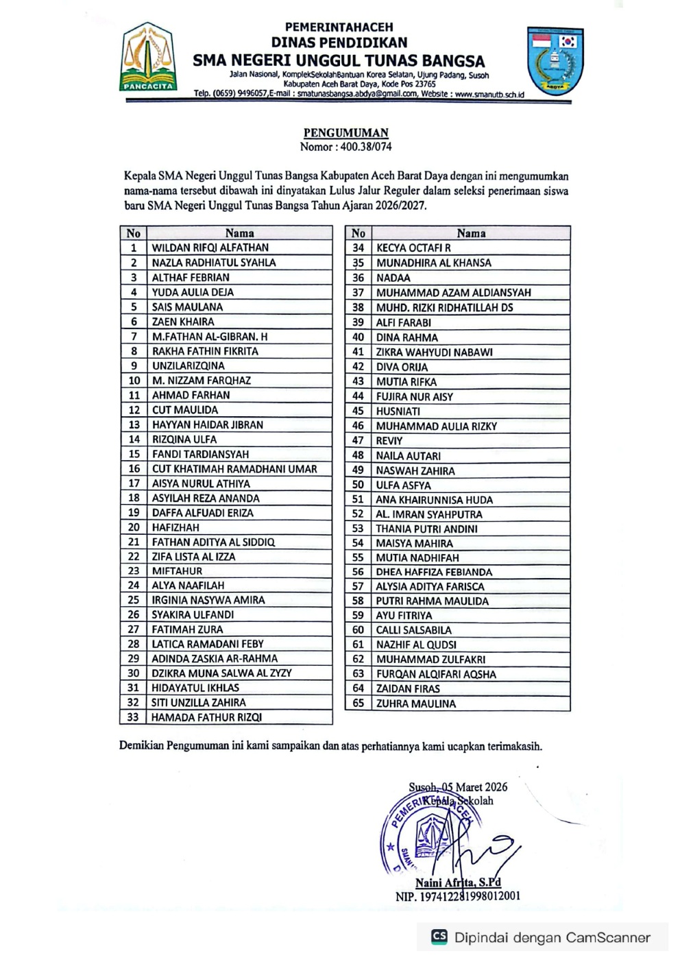 Pengumuman SPMB Jalur Reguler TA.2026/2027