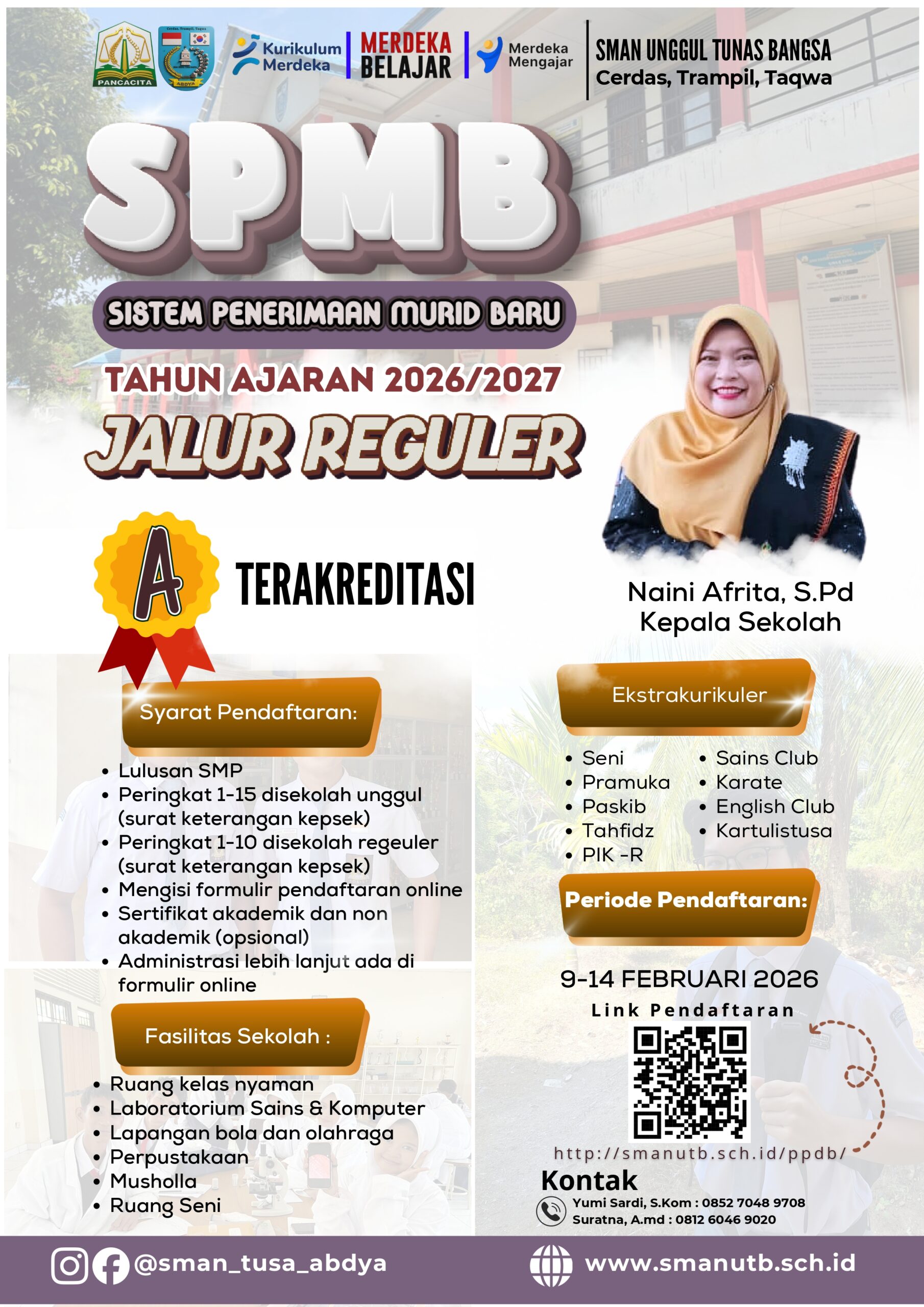 Pendidikan berkualitas adalah investasi terbaik. Kami mengundang Bapak/Ibu untuk mendaftarkan putra-putrinya melalui SPMB Jalur Reguler T.A 2026/2027. Dengan tenaga pendidik profesional dan program unggulan, kami siap mencetak generasi yang berkarakter dan berdaya saing global.